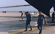 (above) Lunar soil and rocks from Apollo 12 are unloaded from an aircraft. November 1969
