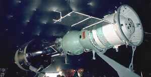 Cette photo montre le moment historique où les astronautes américains dAppollo ont réussi à sarrimer au vaisseau russe Soyuz (à lépoque soviétique), ce qui annonçait laube dune époque de collaboration internationale dans lespace qui continue à l'heure actuelle avec la Station Spatiale Internationale. En 1975 il y eut un progrès important dans les relations entre lUnion Soviétique et les Etats-Unis. Jusque-là les deux superpuissances sétaient servies de lexploration de lespace comme substitut à la confrontation militaire. On pourrait dire qu'ils ressemblaient à deux petits garçons qui cherchaient à s'épater mutuellement! Mais ceci namoindrit pas les résultats des deux nations dans leur exploit en matière d'espace. Ce quelles réussirent fut techniquement brillant.