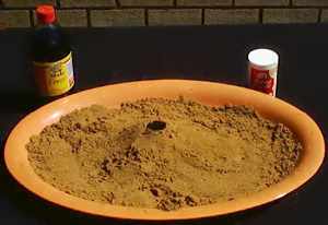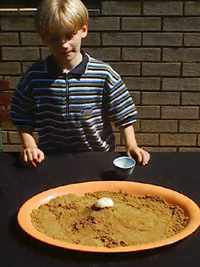 2) Go outside and make a heap of sand. Shape it as you want. Push an egg cup or plastic film canister in the top.