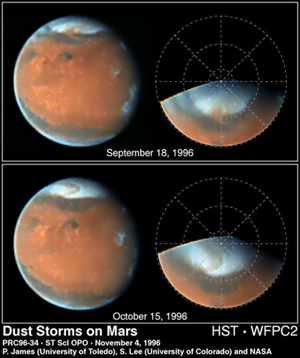 Even though the atmosphere is very thin, the winds are strong enough to raise enormous dust storms that can cover huge areas of the planet and last for weeks at a time. The gravity on Mars is lower than on Earth, so the dust is lighter, and will rise even in the thin atmosphere. The image above, taken by the Hubble Space Telescope, shows the movement of an enormous dust storm across the north polar cap.