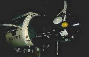 The first space station, Salyut 1, was launched by the Soviet Union - now Russia - on 19 April, 1971. It remained in orbit until 11 October that year. Five more Salyut craft were launched, and one failed to reach orbit over the following eleven years. Many space endurance records were set up by crews aboard the Salyut space stations. Little information was revealed about the purpose or work of them, however, but they made major contributions to our understanding of the effects of prolonged spaceflight on human beings. Additionally, many EVA techniques were developed and refined, so that walking in space became routine by the end of the Salyut era in 1985. As with the Skylab (see below), the re-entry of these enormous craft into the Earth's atmosphere caused problems for those below. Fortunately no-one was hurt, but minor property damage did result on occasions.