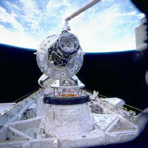In this fish-eye image above, looking into the Shuttle Orbiters' cargo bay the ISS is under assembly using the shuttle's robot arm, the American Unity Module is joined to the Russian Zarya Module already in orbit.